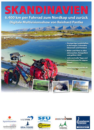 Tromsø Gut die Hälfte des Vortrags befasst sich mit Norwegen: Vom Nordkap aus geht es über 2.500 km durch Norwegen zumeist entlang der Küsten, gezeigt werden unter anderem Bilder und Filme von den norwegischen Lofoten, der vielfältigen Straße 17, die zurecht als eine der schönsten Küstenstraßen der Welt gilt und Teilen des norwegischen Fjordlandes. Der Globetrotter zieht mit seinen interessanten und witzigen Erzählungen Zuschauer in seinen Bann und bringt Ihnen eine Langezeitreise per Fahrrad näher. Der Mammuttrip endet mit herbstlichen Impressionen aus Dalsland und Värmland und wird ergänzt durch einige Winterbilder aus Nordschweden.